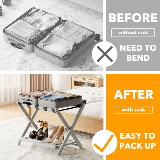Fully Assembled Bamboo Foldable Luggage Rack with Storage Shelf, Gray