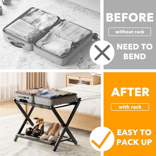 Fully Assembled Bamboo Foldable Luggage Rack with Storage Shelf, Black