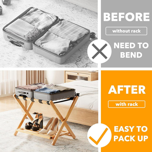 Fully Assembled Bamboo Foldable Luggage Rack with Storage Shelf, Natural