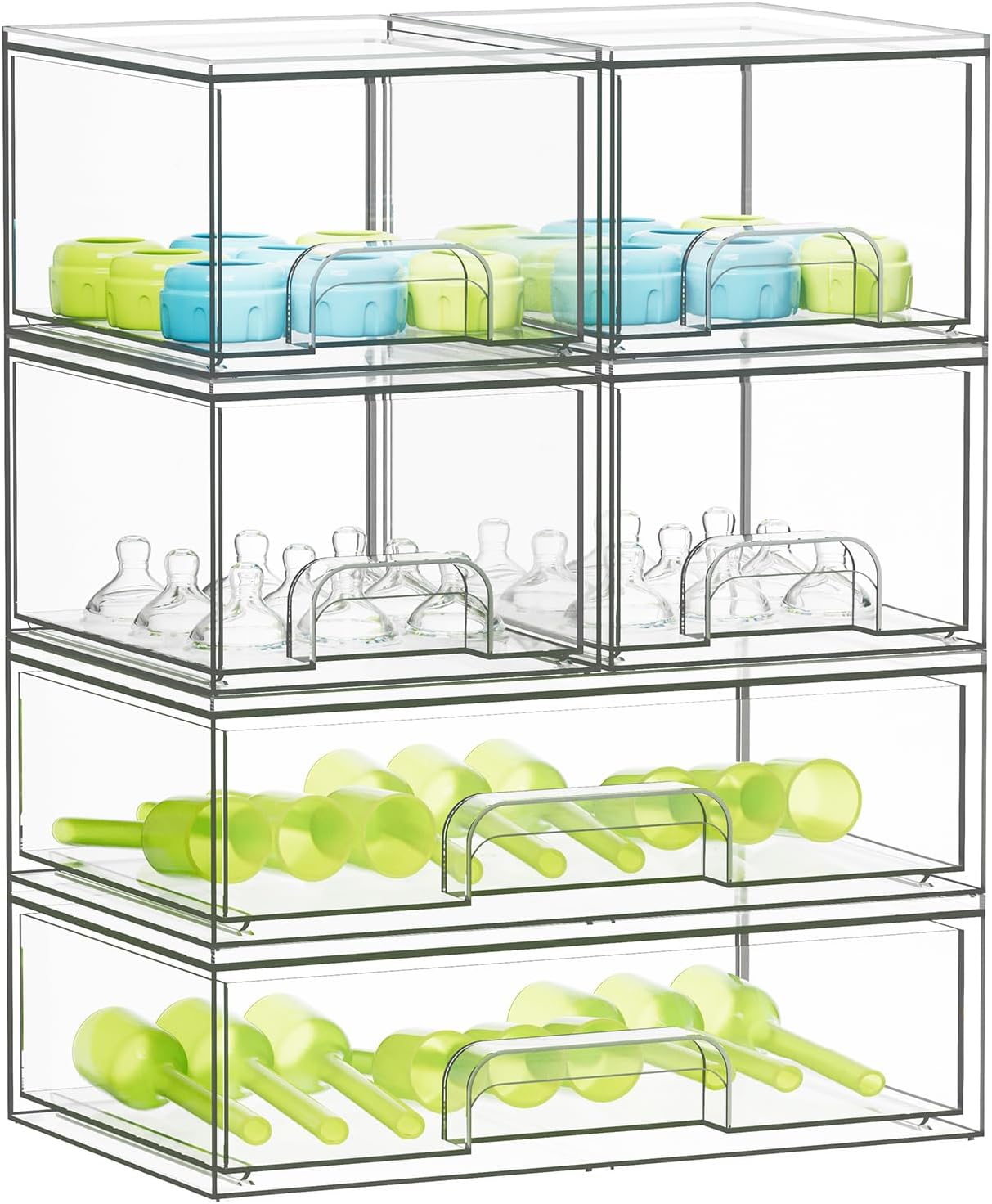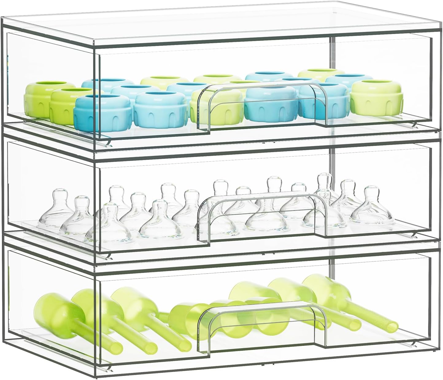 Clear Visibility – Transparent bins let you see contents at a glance, making it easy to find bottles, pump parts, makeup, or household essentials quickly.