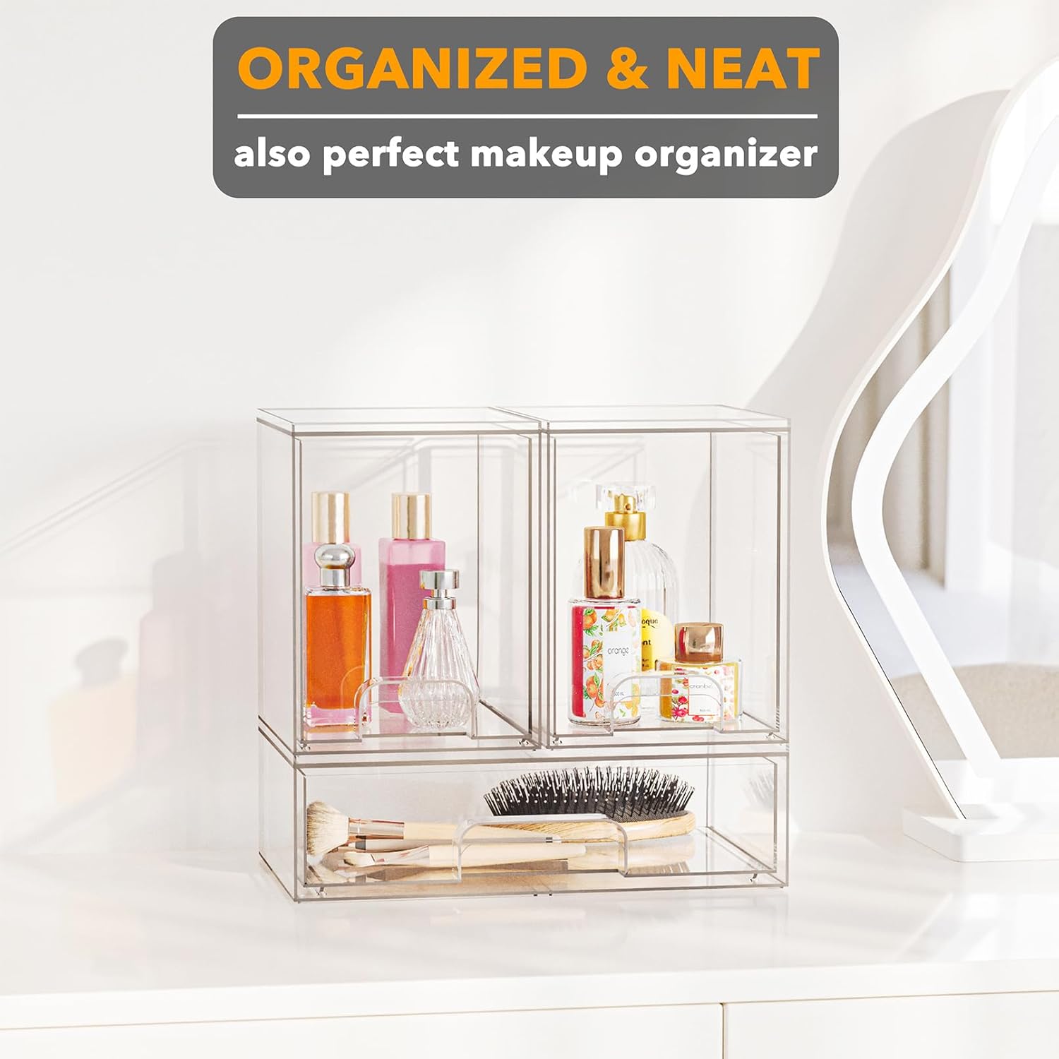 Clear Visibility – Transparent bins let you see contents at a glance, so you can quickly find bottles, pump parts, makeup, or daily essentials with zero fuss.