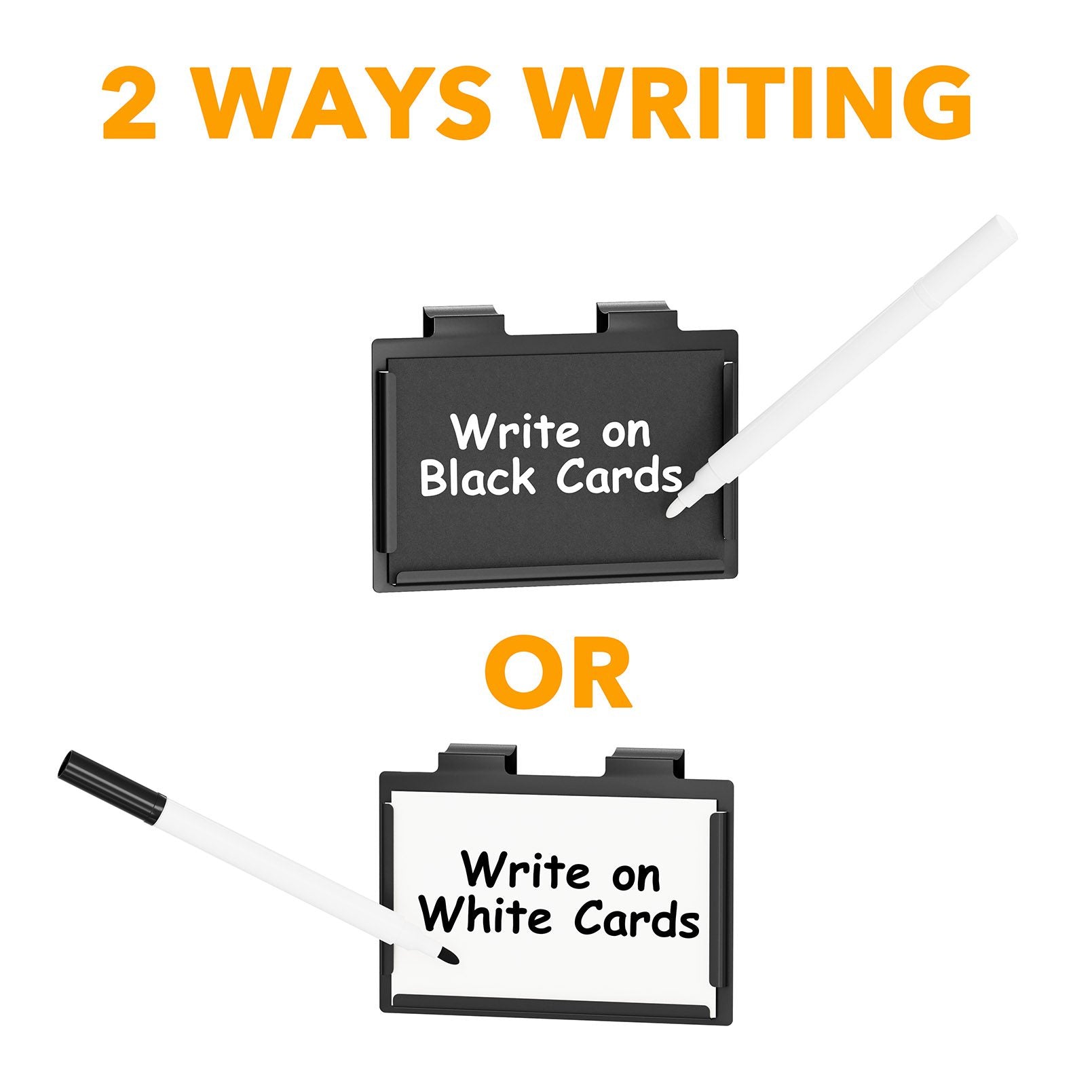 - INCLUDED ITEMS - This set includes 10 black label holder clips (Size: 3.5" x 2.5"), 10 white label cards, 10 black label cards, 1 white chalk marker, and 1 black chalk marker. You'll find everything you need to effectively organize your home pantry baskets.