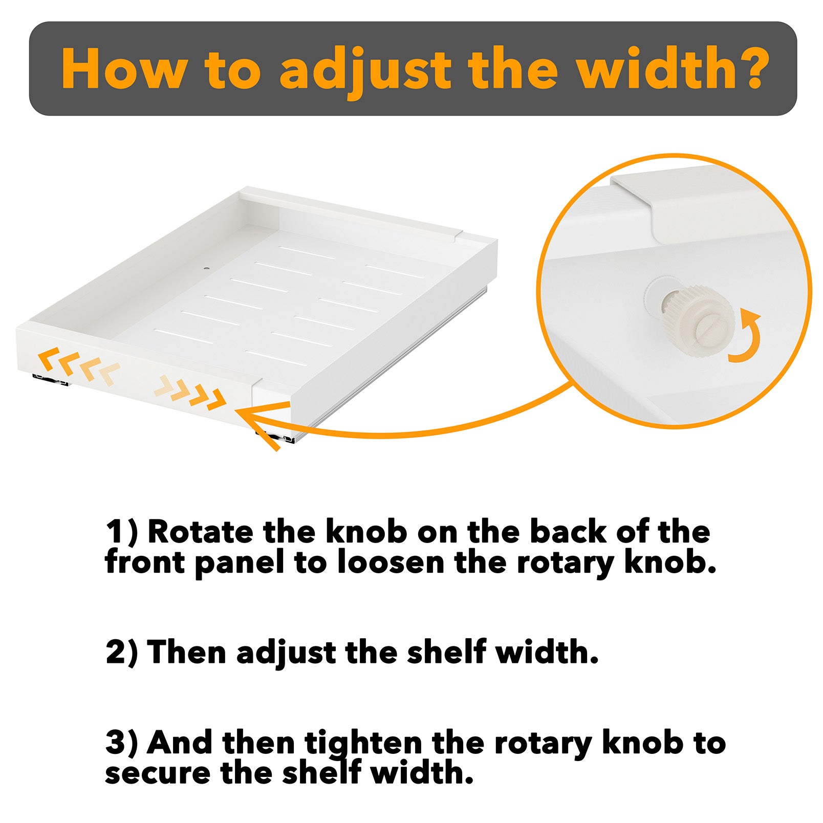 WIDTH EXPANDABLE RACK - This adjustable pull-out cabinet organizer features a width that can be extended. The no-drill drawer adjusts from 11.8" to 19.6" in width. Tailor the peel-and-stick drawers to fit a variety of kitchen cabinets. DIMENSIONS: 17"D x (11.8-19.6")W x 2.3"H.