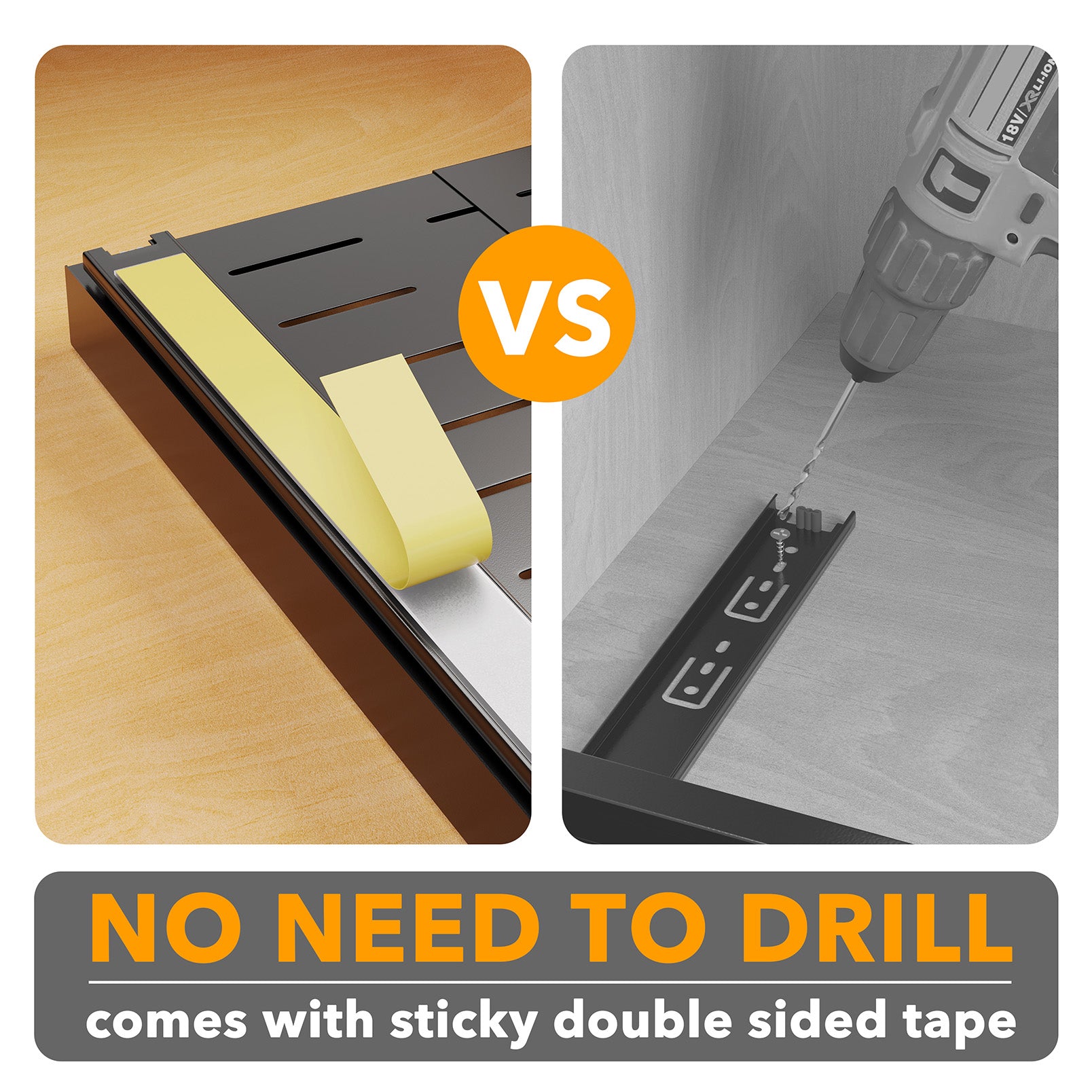 EASY INSTALLATION WITHOUT DRILLING - Installing the slide-out cabinet organizer is a breeze with the provided double-sided adhesive tape. There's no need for drilling, and the adhesive is strong enough to securely hold the organizer.