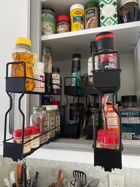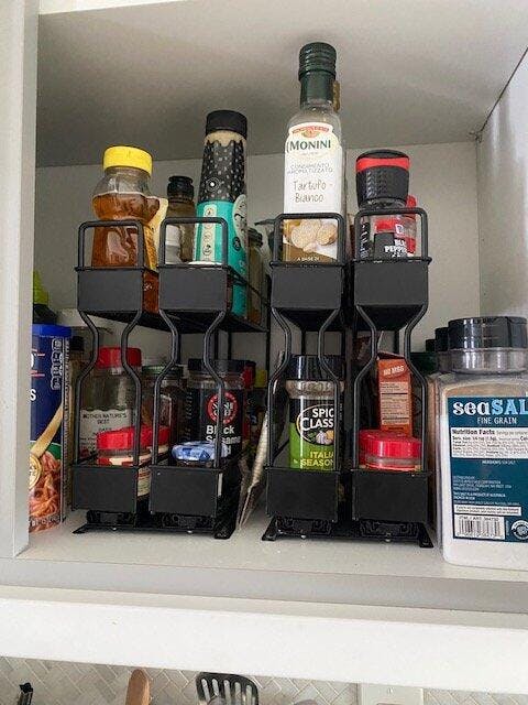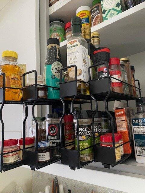 It organized everything, making all the labels easy to see. It's sturdy and matches the other pull-out drawers in my kitchen.